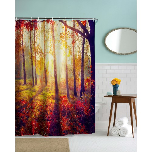 Polyester Fabric Shower Curtain, Autumn Fall Forest Sunshine Print Waterproof and Mildew Resistant and 72 x 72 Inch Bath Curtains, Gold Red and Brown(Sunshine Forest)